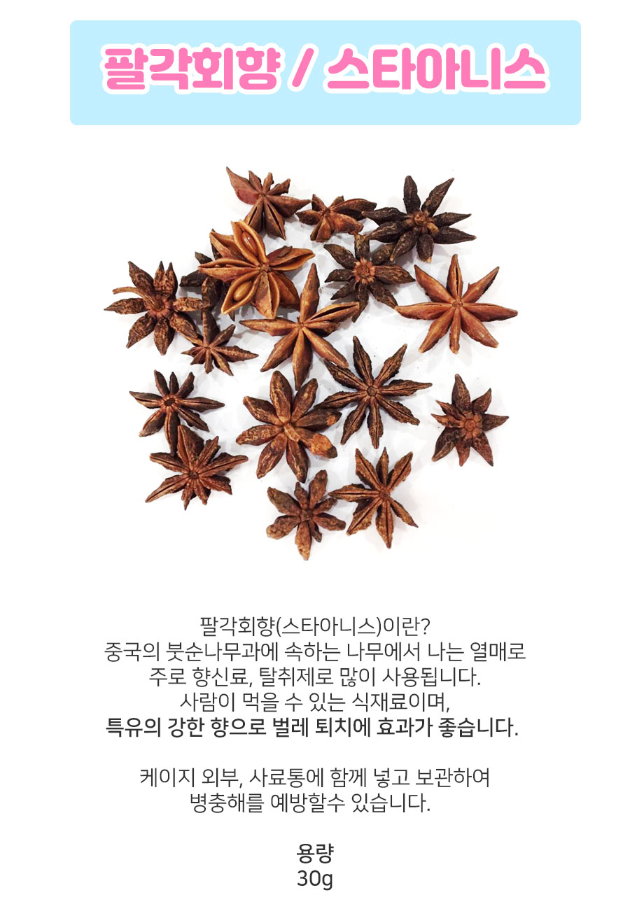 햄찌 집 철망에도 걸어두고 저희 집 구석에 혹시 몰라서 곳곳에 둬서 예전에 타 사이트에서 구매한게 다 떨어져서 햄찌네에서 구입하면서 끼워 샀어요 ! 그런데 타사에 비해서 크기가 작고 많이 부서진게 좀 흠이네요 ㅠㅠㅠ 물론 다 같은 팔각향이겠지만 큰걸 선호해서...ㅠㅠ |
